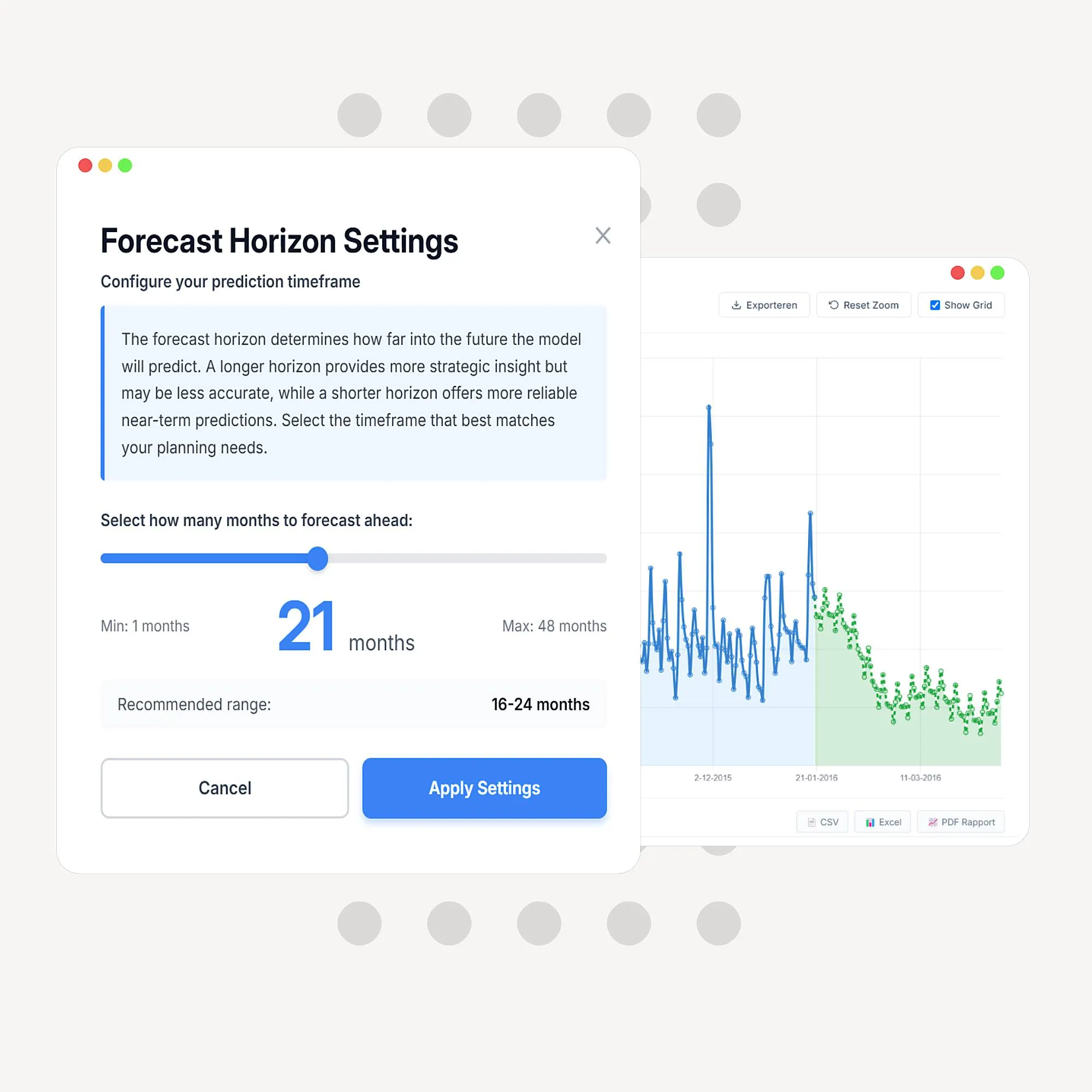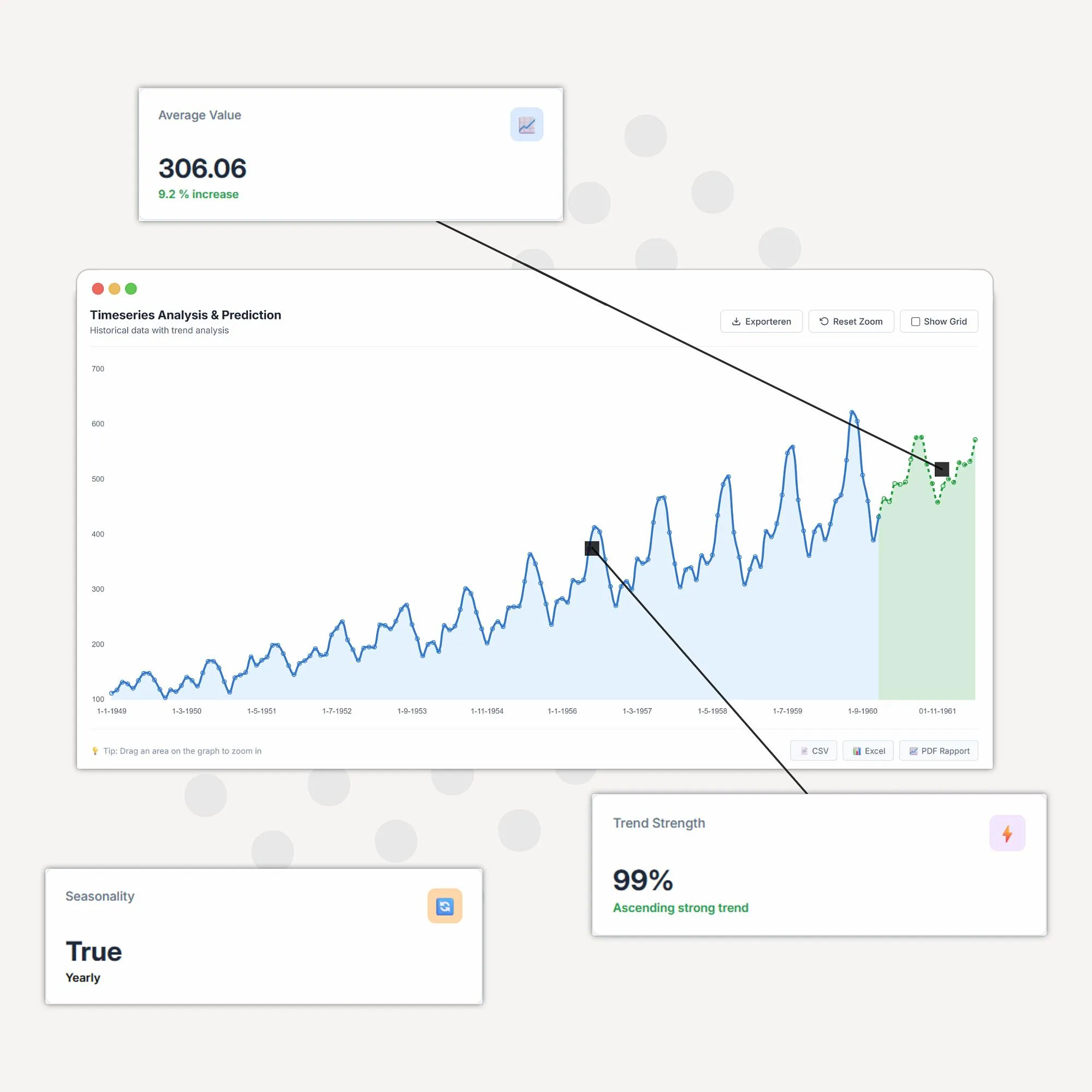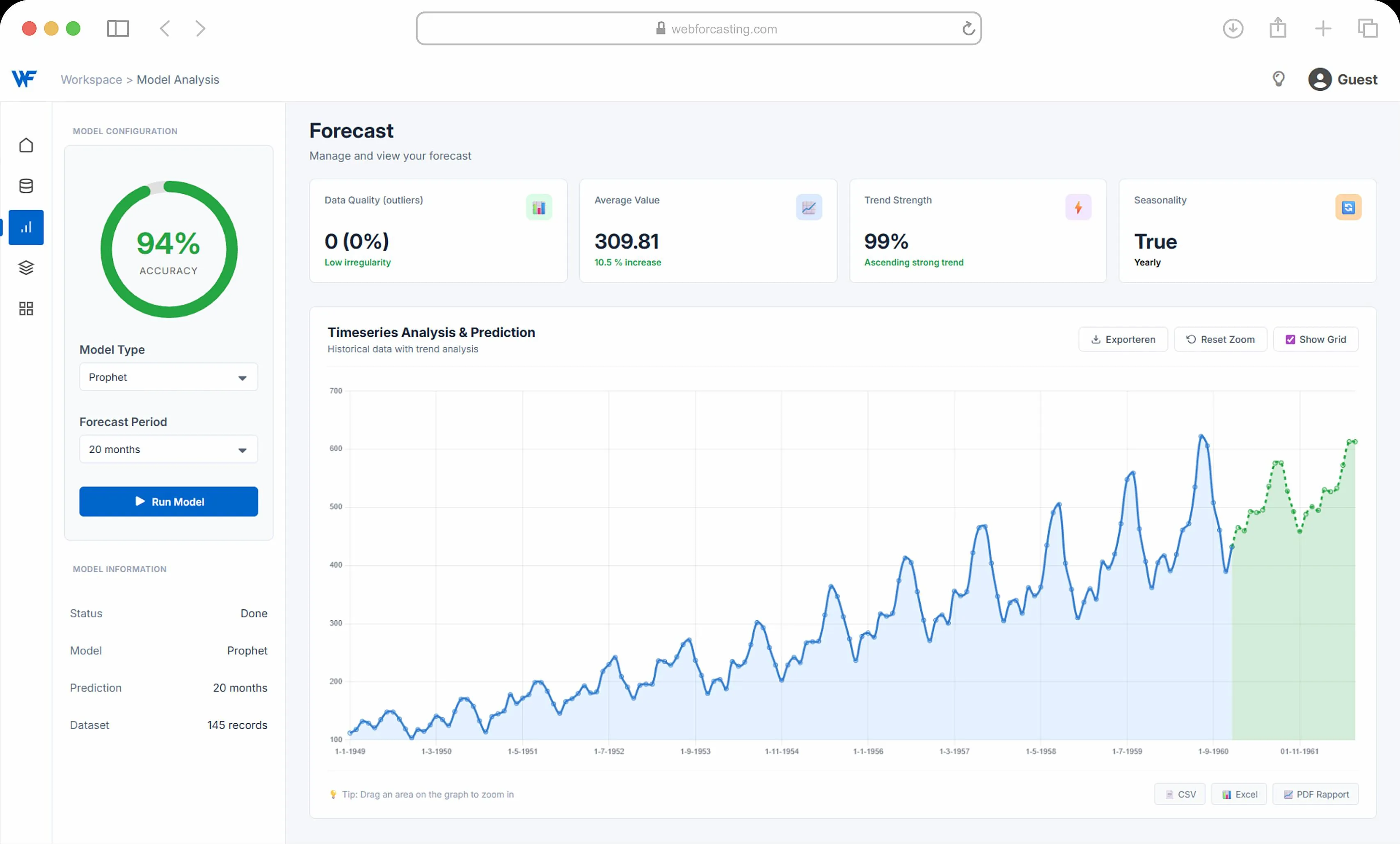 Drop your data, pick your forecast period, done. No data scientist required.